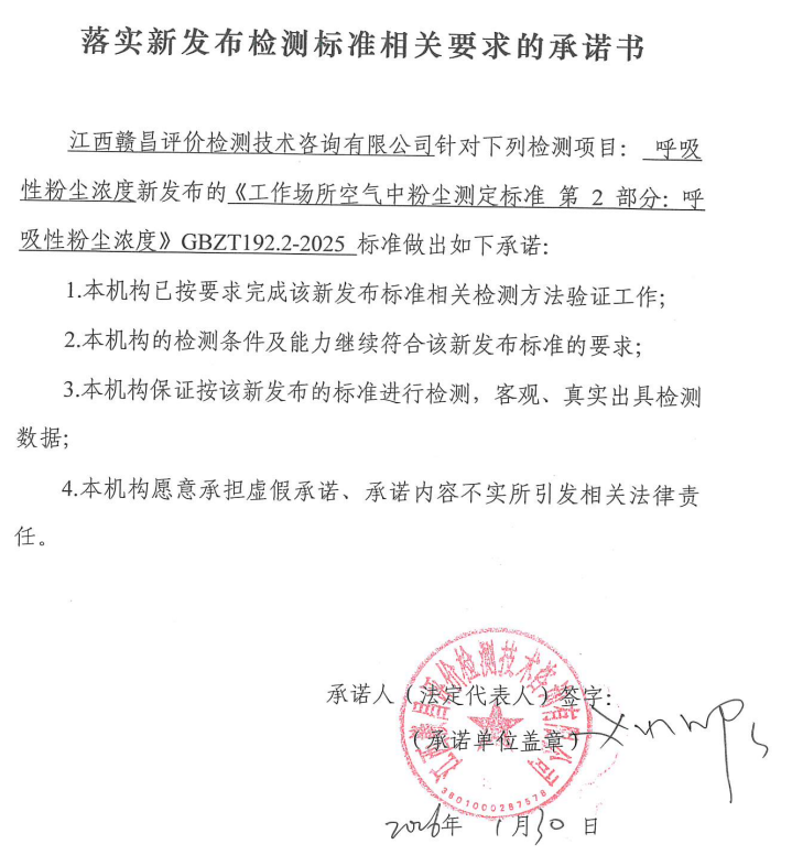关于落实新发布检测标准(呼吸性粉尘浓度)相关要求承诺书