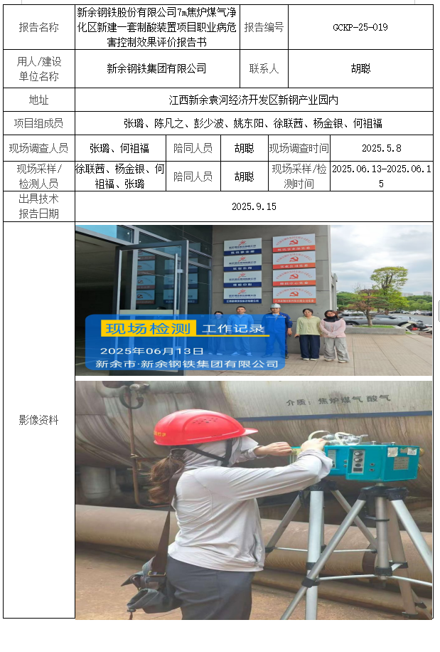新余钢铁股份有限公司7m焦炉煤气净化区新建一套制酸装置项目职业病危害控制效果评价报告书