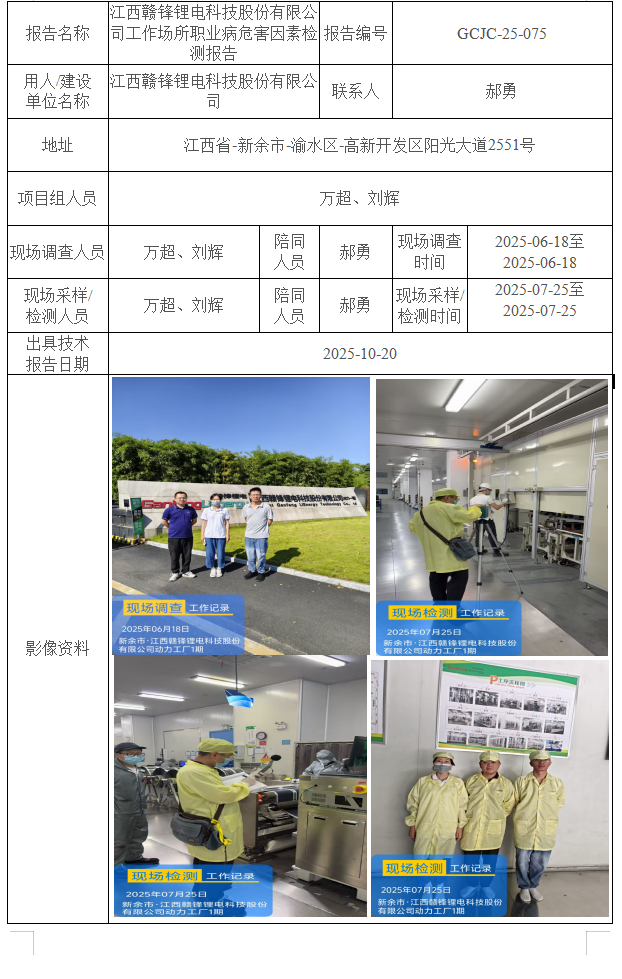 江西赣锋锂电科技股份有限公司工作场所职业病危害因素检测报告