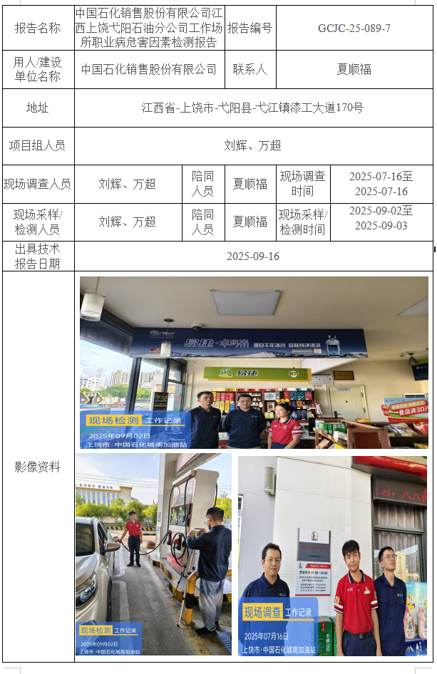 中国石化销售股份有限公司江西上饶弋阳石油分公司工作场所职业病危害因素检测报告