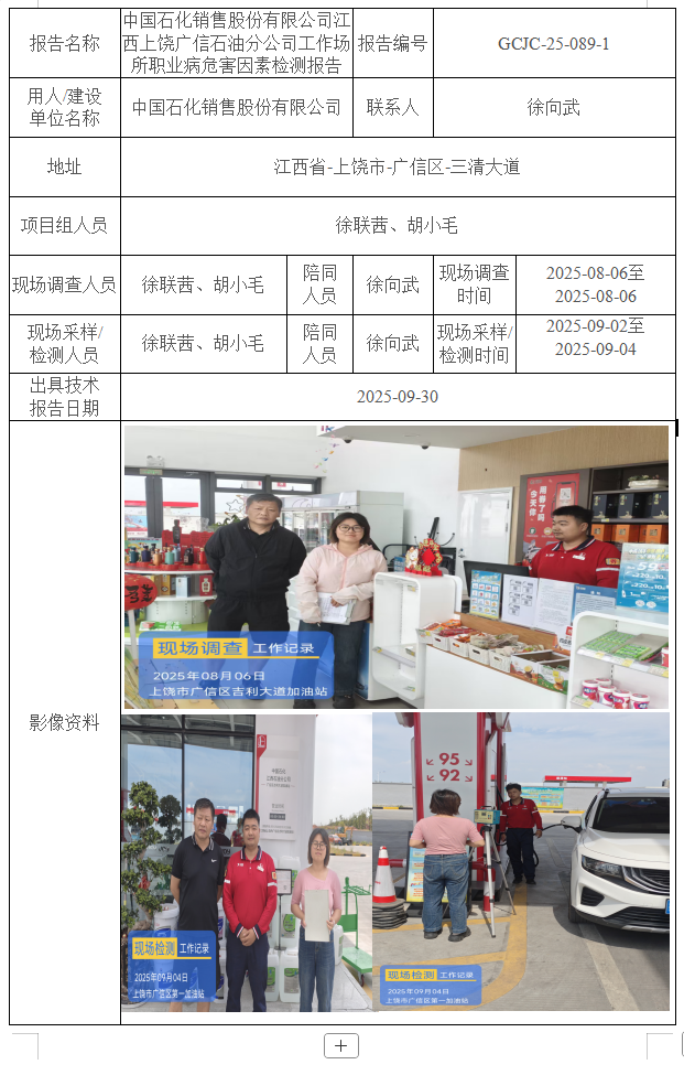 中国石化销售股份有限公司江西上饶广信石油分公司工作场所职业病危害因素检测报告