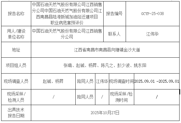 中国石油天然气股份有限公司江西销售分公司中国石油天然气股份有限公司江西南昌县陆港新城加油站迁建项目 职业病危害预评价