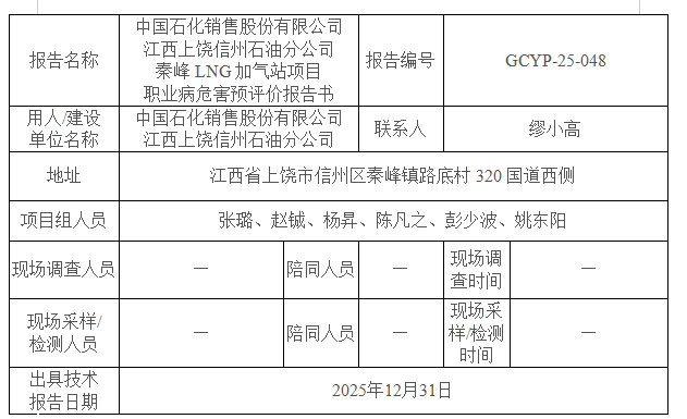 中国石化销售股份有限公司 江西上饶信州石油分公司 秦峰LNG加气站项目 职业病危害预评价报告书