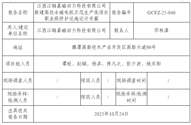 江西江铜嘉磁动力科技有限公司新建高效永磁电机示范生产线项目职业病危害预评价报告书