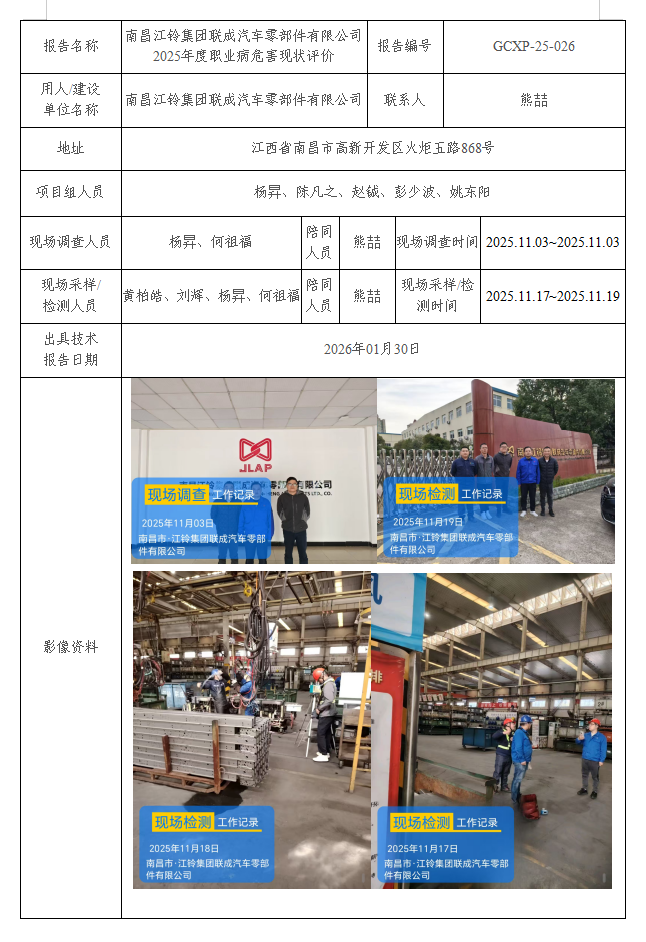 南昌江铃集团联成汽车零部件有限公司 2025年度职业病危害现状评价