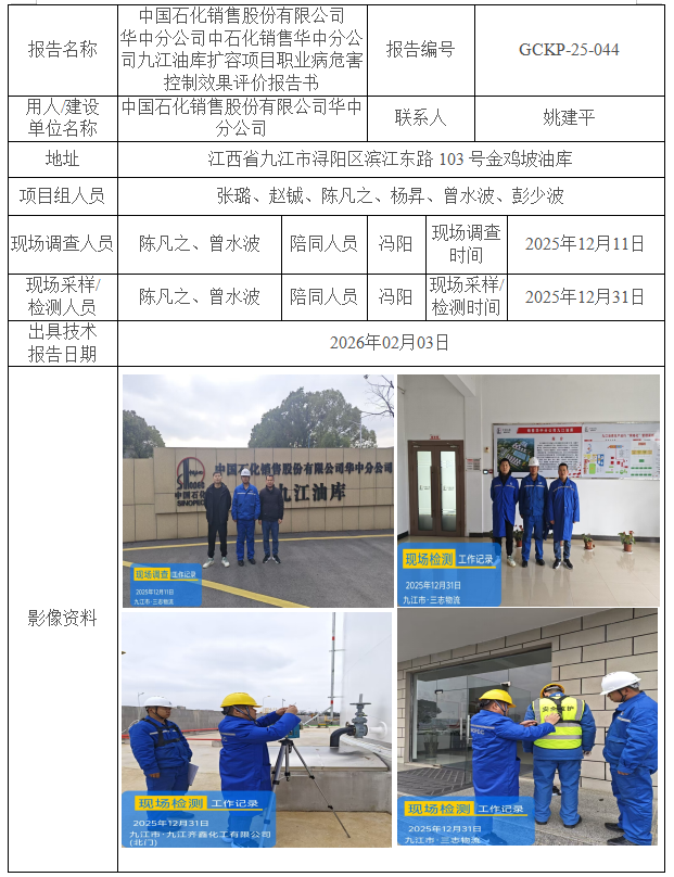 中国石化销售股份有限公司华中分公司中石化销售华中分公司九江油库扩容项目职业病危害控制效果评价报告书