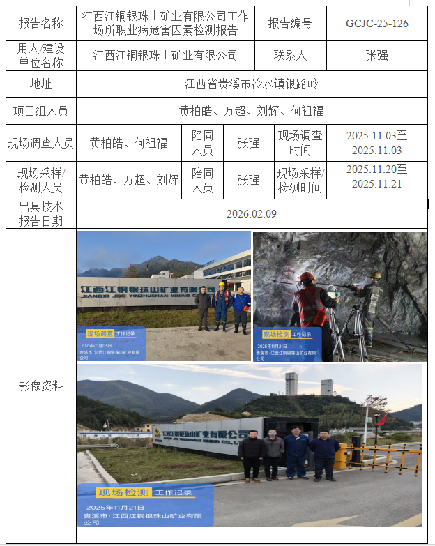 江西江铜银珠山矿业有限公司工作场所职业病危害因素检测报告