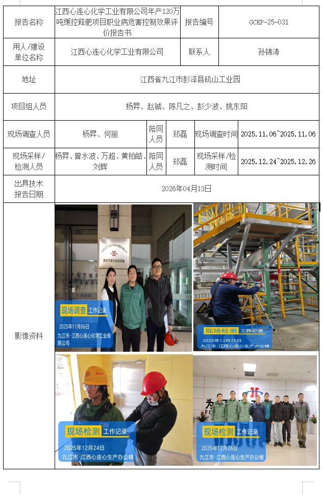 江西心连心化学工业有限公司年产120万吨缓控释肥项目职业病危害控制效果评价报告书